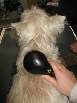 Lasertherapie bei einem Hund mit Knochenhautentzündung der Wirbelsäule im Bereich Hals-Brustübergang.