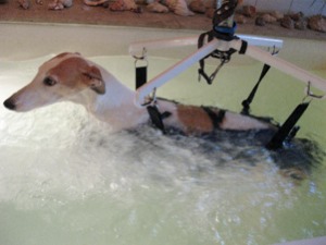 Beim Schwimmen, wie z. B. im Bewegungsbad bei 20 - 23 °C warmen Wasser, wird die Körpermasse auf 10% reduziert. Durch die gleichmäßige Schwimmbewegung kommt es zum Muskelaufbau. Die Gelenke werden geschont, aber die Beweglichkeit der Gelenke gefördert, da durch die Bewegung mehr Gelenksflüssigkeit gebildet wird, was wiederum die Gelenkschmierung und -geschmeidigkeit verbessert. Die Schmerzhaftigkeit in den Gelenken wird vermindert und das Tier kann insgesamt besser laufen. Außerdem wird die Kondition des Tieres wesentlich verbessert. Allerdings sollte ein Hund nicht länger als 20 Minuten schwimmen, da dies für ihn wie ein zweistündiger Spaziergang ist und der Stoffwechsel durch die gleichmäßige Bewegung sehr stark angeregt wird.